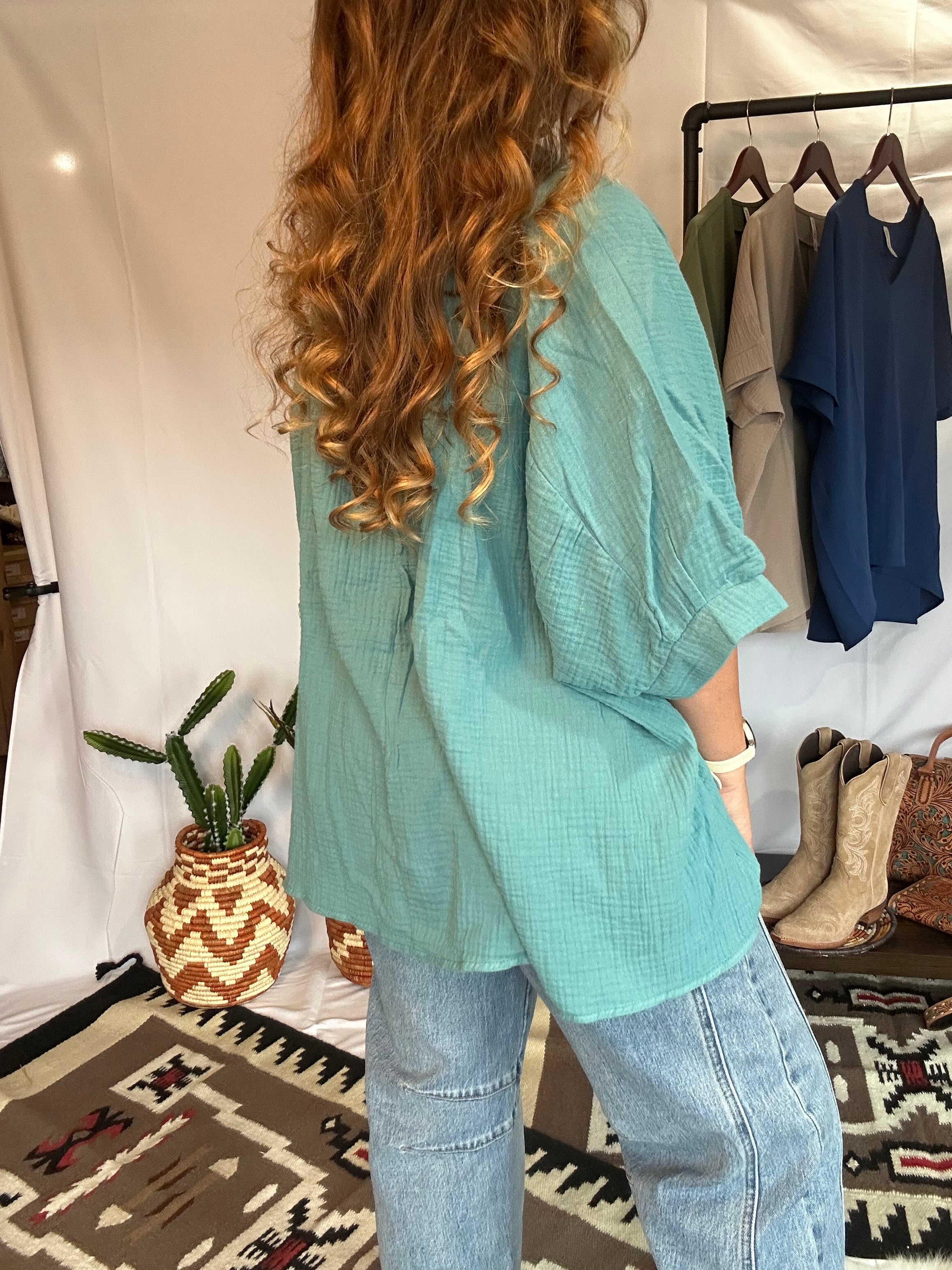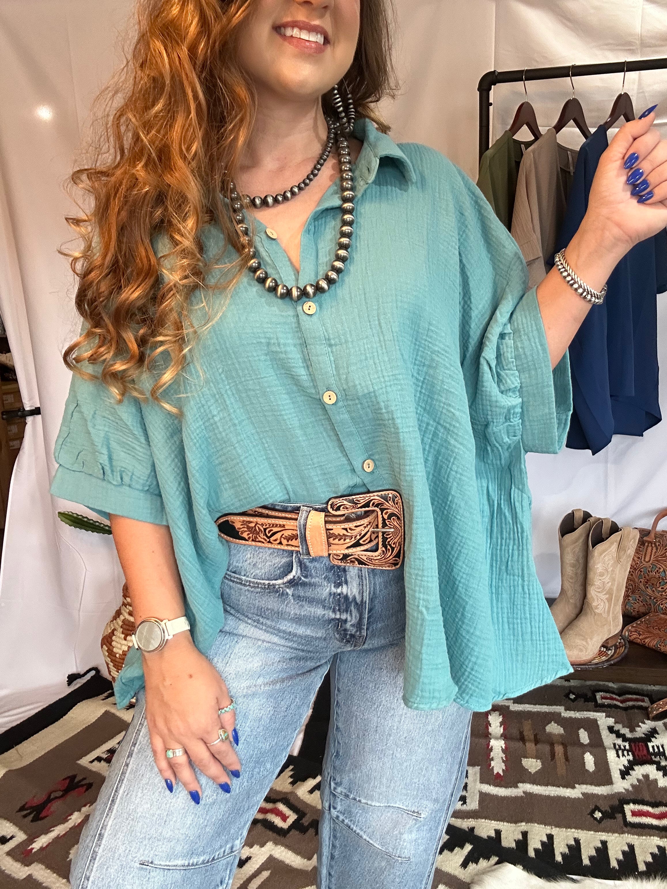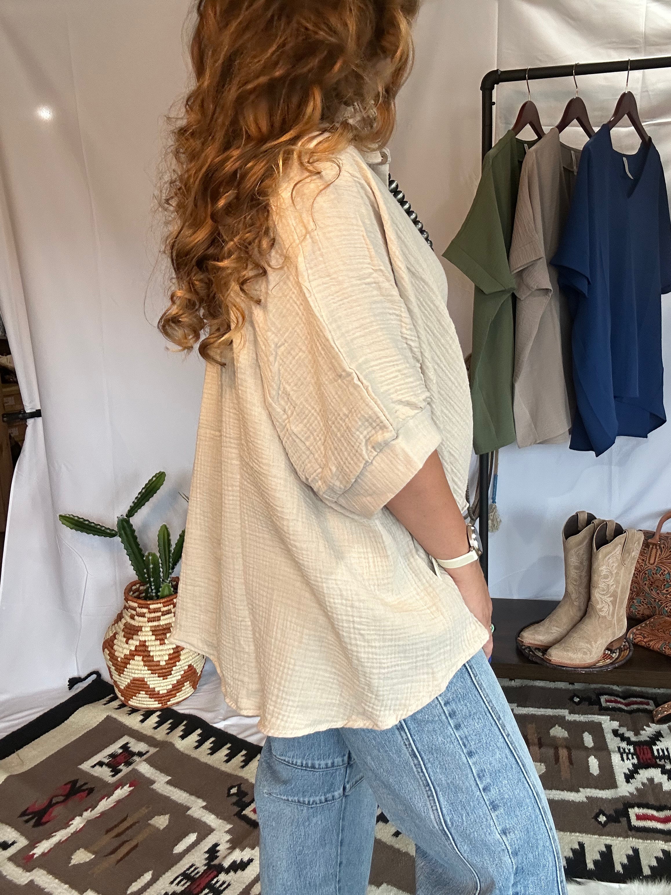 Light as a breeze, bold as your spirit—this button down blouse is your new ride-or-die for all things easy, airy, and effortlessly Western. Crafted from crinkled gauze fabric that floats like a summer wind, it’s got that oversized fit we love with just enough structure to feel styled, not sloppy.
