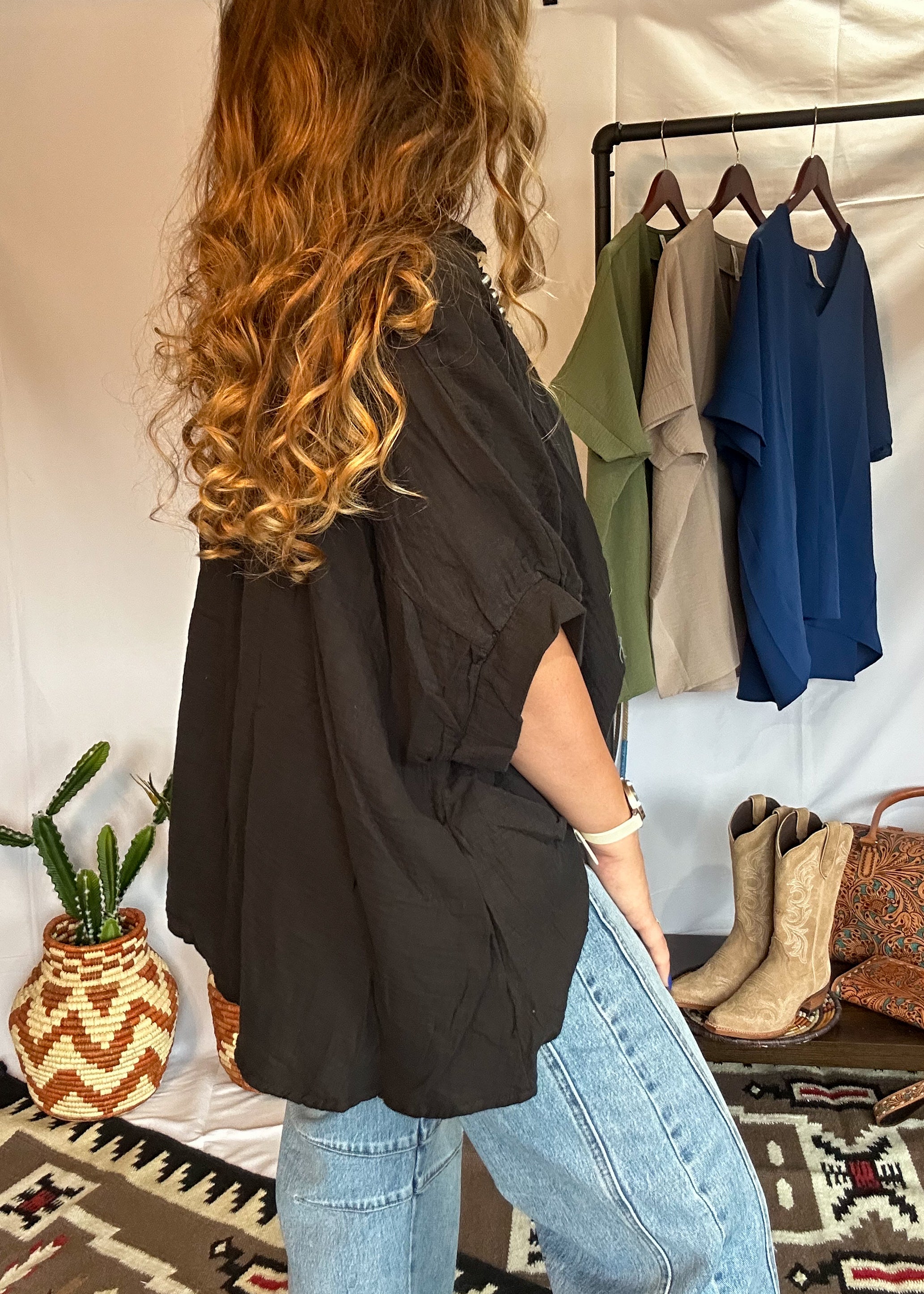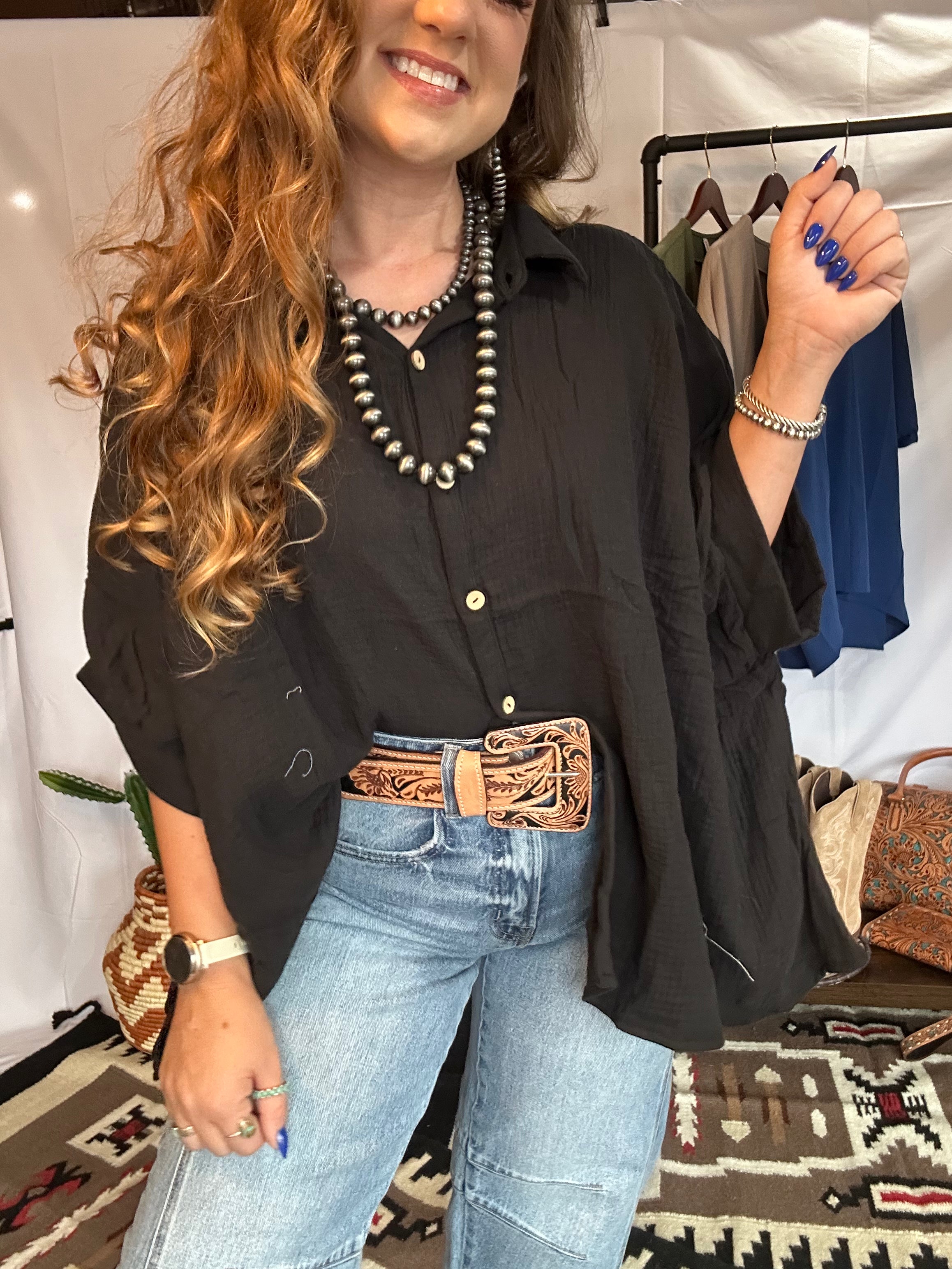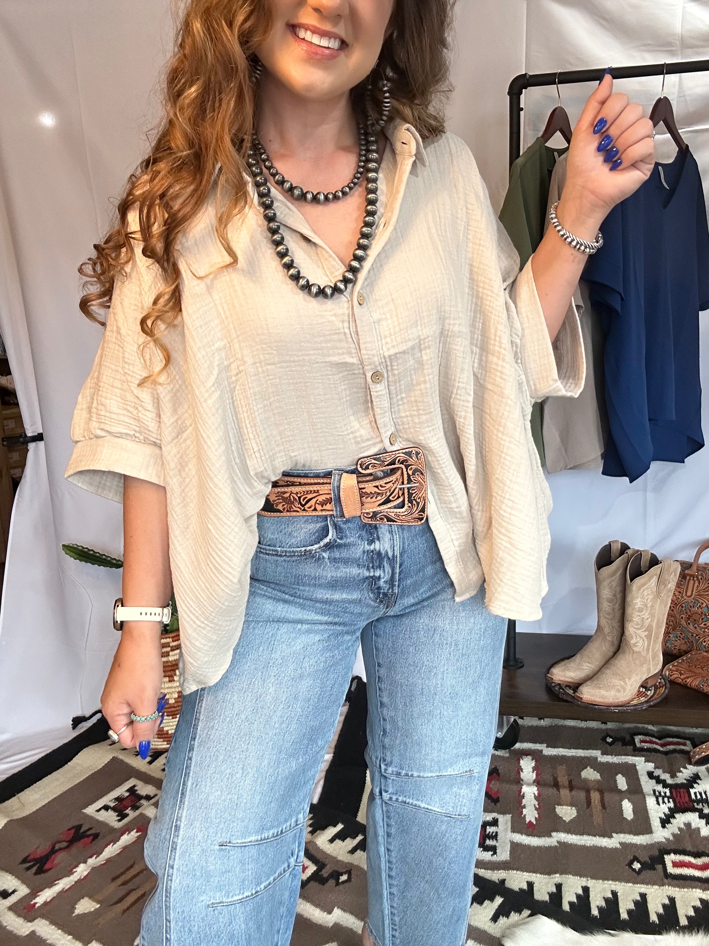 Light as a breeze, bold as your spirit—this button down blouse is your new ride-or-die for all things easy, airy, and effortlessly Western. Crafted from crinkled gauze fabric that floats like a summer wind, it’s got that oversized fit we love with just enough structure to feel styled, not sloppy.