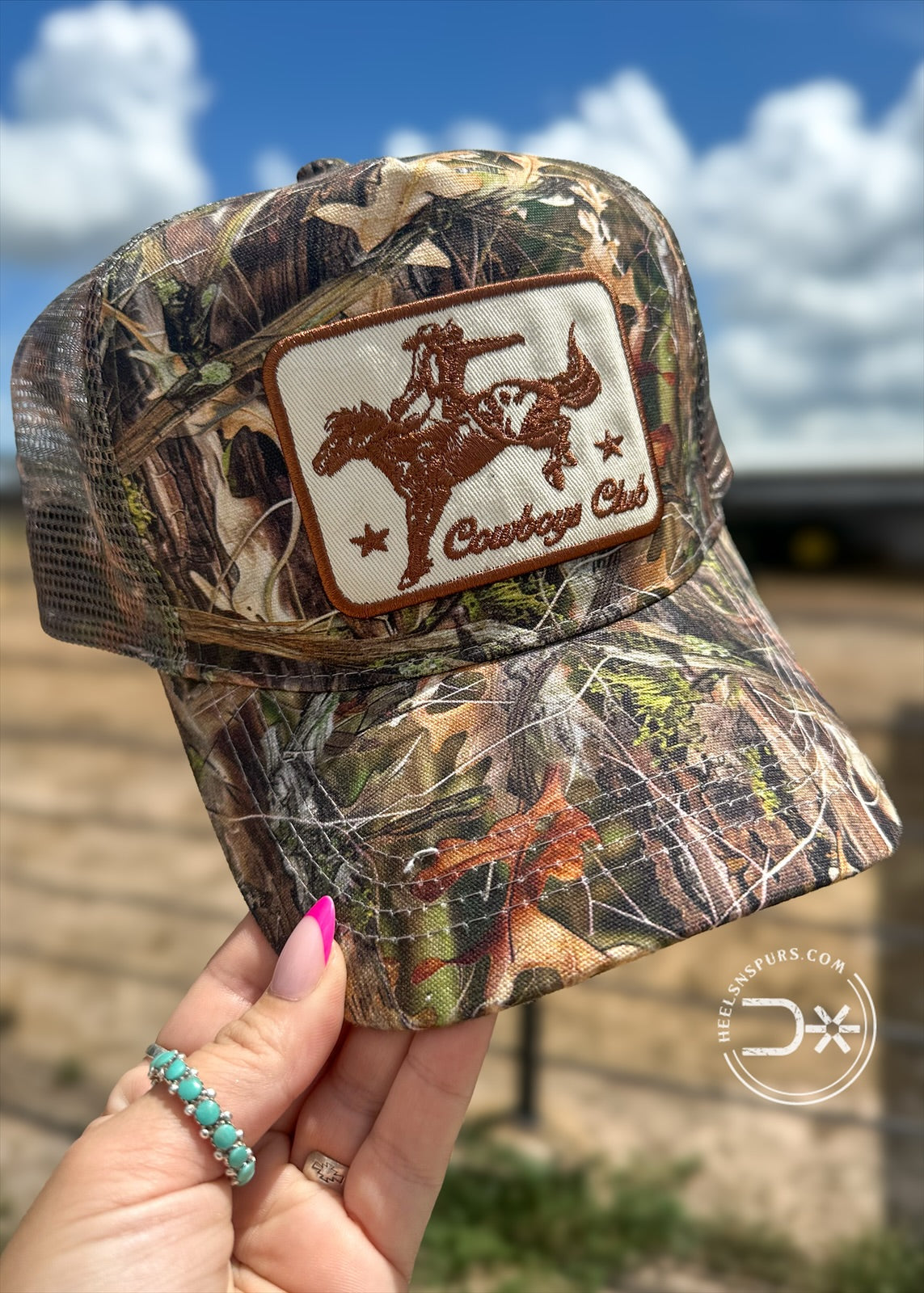 Ride wild and blend in, cowgirl. The Cowboy Club Camo Hat brings western grit to the great outdoors with a buckin’ bronc patch, camo print, and breathable mesh back. Whether you're ropin’ calves or hittin’ the road, this one’s got your crown covered in cowboy style.