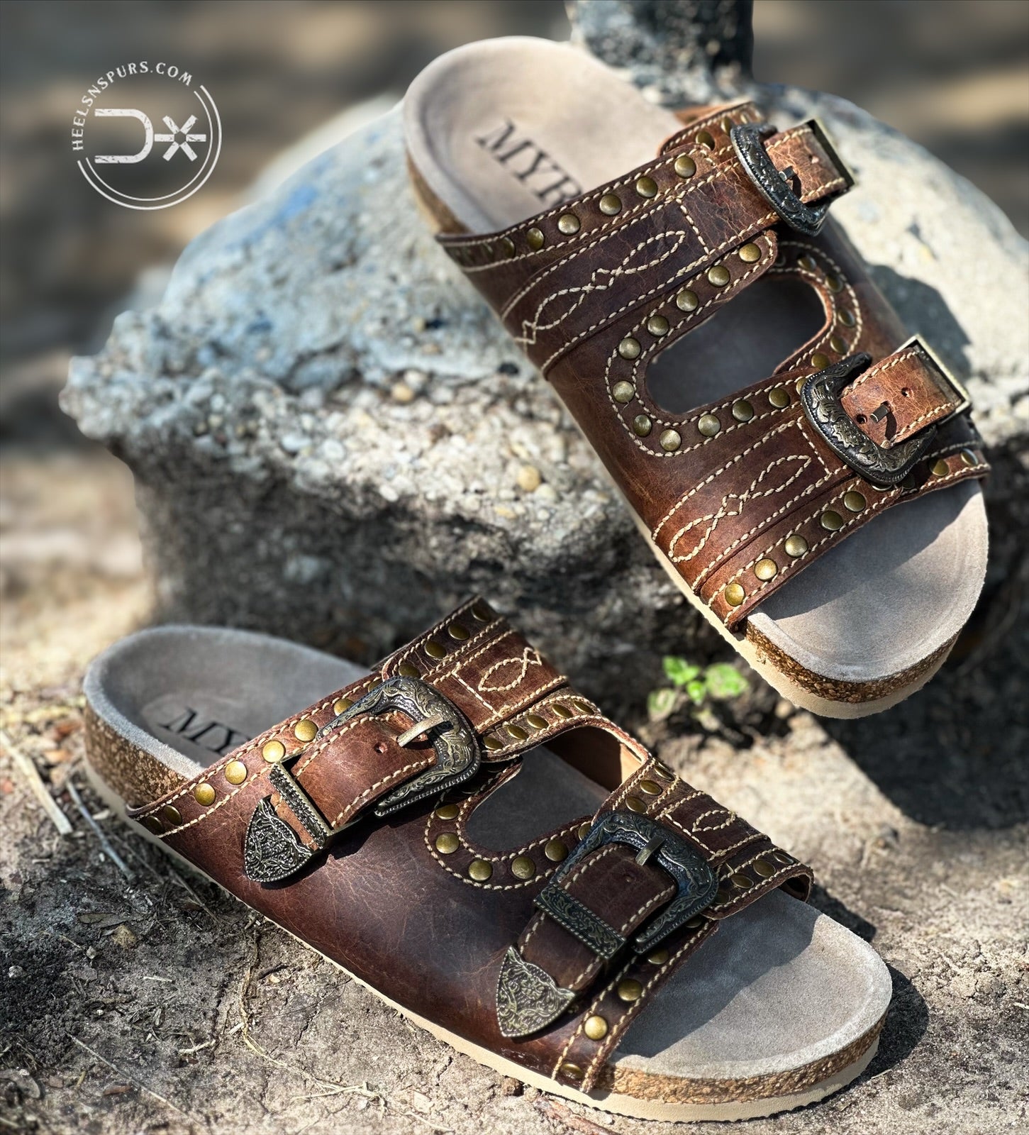 Channel your inner cowgirl with our luxuriously rugged comfort slides. Crafted from rich leather with authentic Western buckles, brass studs, and hand-stitched detailing. The cork footbed molds to your feet while the vintage inspired design pairs perfectly with everything from denim to sundresses. You'll love your look with every comfortable step!
