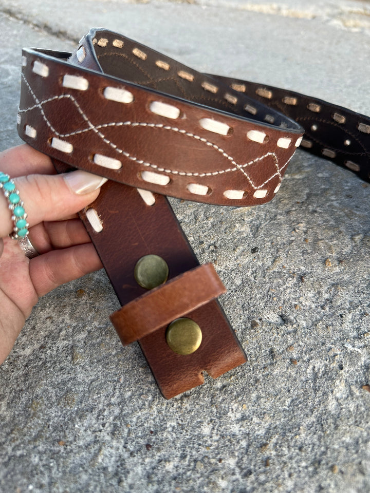 Keep it classic and customizable with the Leather Stitched Belt. Sold without a buckle, this genuine leather beauty features an easy snap closure, so you can pop on your own favorite buckle—whether you're goin' rhinestone rodeo or keepin' it old-school outlaw. With clean stitching and timeless western edge, this one’s made for the buckle-lovin’ kind.