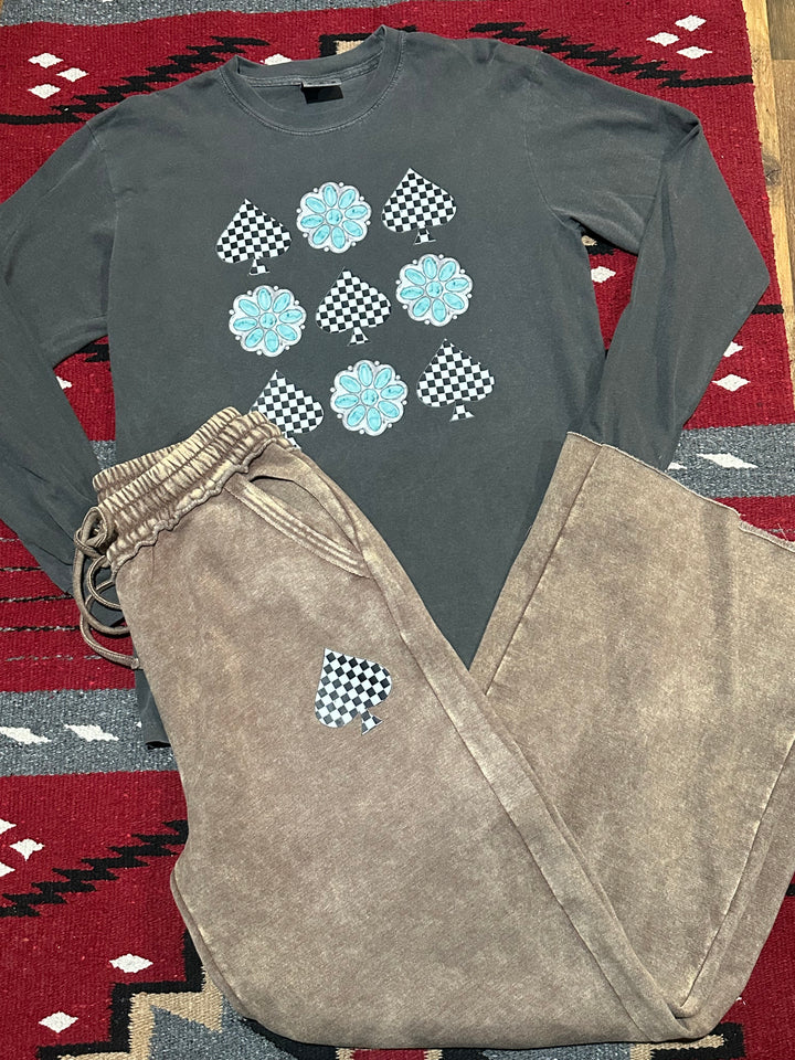 Whether you’re headed out for errands or just stayin’ in with sweet tea and re-runs, the Spades & Turquoise Cozy Set in size Medium brings that Western edge with a laid-back twist. The charcoal long sleeve is decked out in checkerboard spades and turquoise blooms, while the stonewashed joggers feature a playful matching spade that ties it all together. Cute, comfy, and ready to lounge like a cowgirl queen.