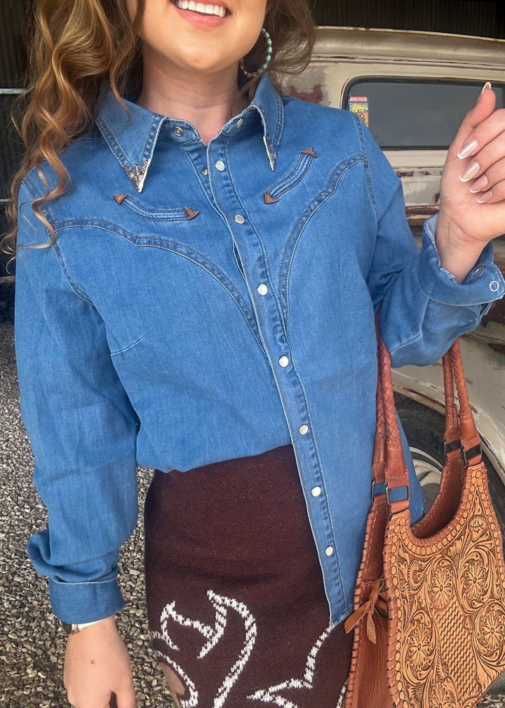 Classic cowgirl lines with just enough edge. The Arrowhead Western Denim Button-Up is built on timeless denim and finished with subtle arrow stitch detailing that gives a nod to traditional Western wear without feeling overdone. Easy, flattering, and made to wear year after year.