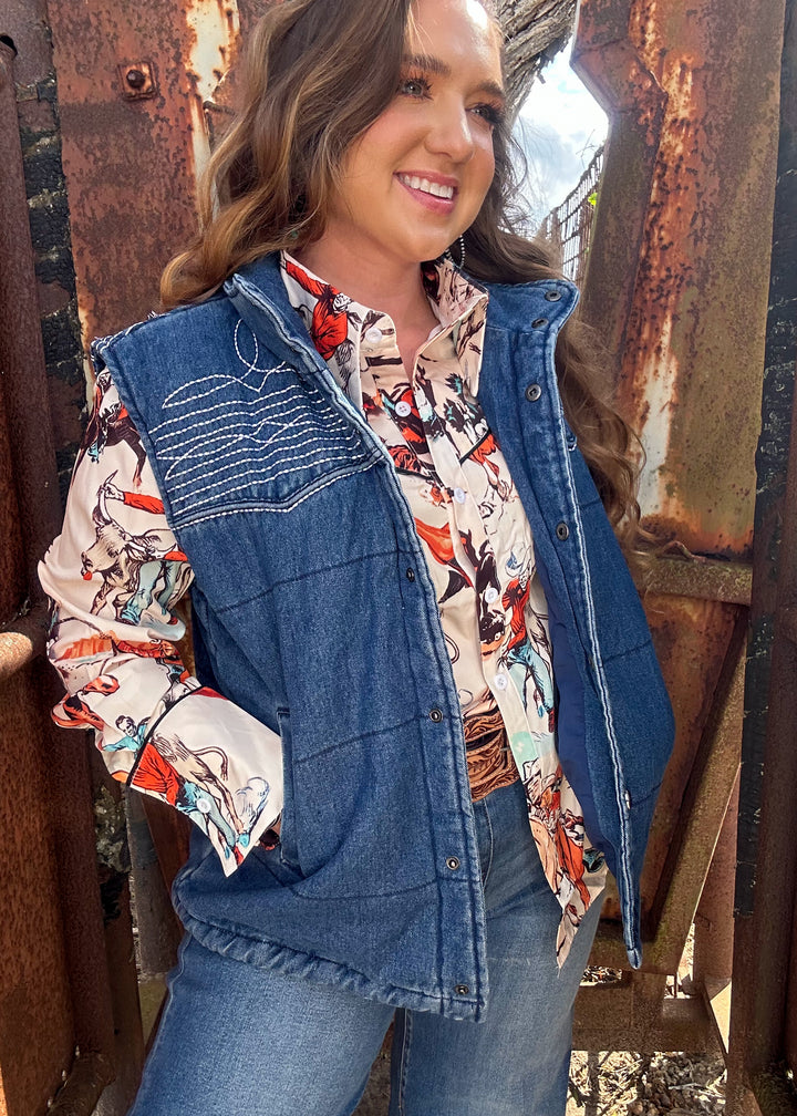 A true Western layer with everyday edge. The Backroad Stitch Denim Vest features classic denim construction with bold stitch detailing across the chest for a look that feels timeless, rugged, and ready for anything. Perfect for layering over button-ups, graphics, or knits.