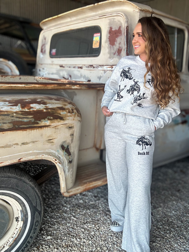 For the cowgirl who lives for the eight-second ride—this gray lounge set brings rodeo grit to your everyday style. The bold bronc silhouettes across the chest capture the raw action of the arena, making it a must-have for any Western wardrobe.