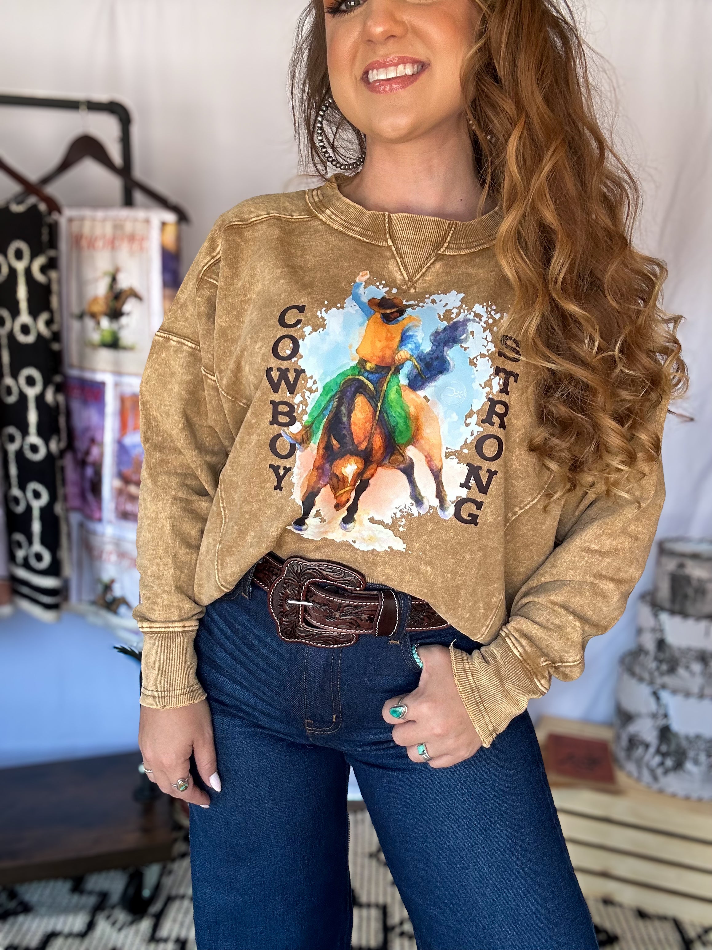 Bold, rugged, and full of grit—the Cowboy Strong Pullover is built for those who carry the Western spirit wherever they go. With its garment-washed finish and striking bronc rider artwork, this piece captures the heart of rodeo life while keeping you cozy.