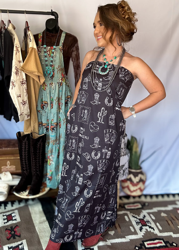 Make a bold Western statement with this strapless beauty covered in playful sketches of boots, cacti, cards, and lucky horseshoes. The Cowgirl Graffiti Maxi is easy, flowy, and full of cowgirl attitude—perfect for rodeo nights or casual days when you want all eyes on you.
