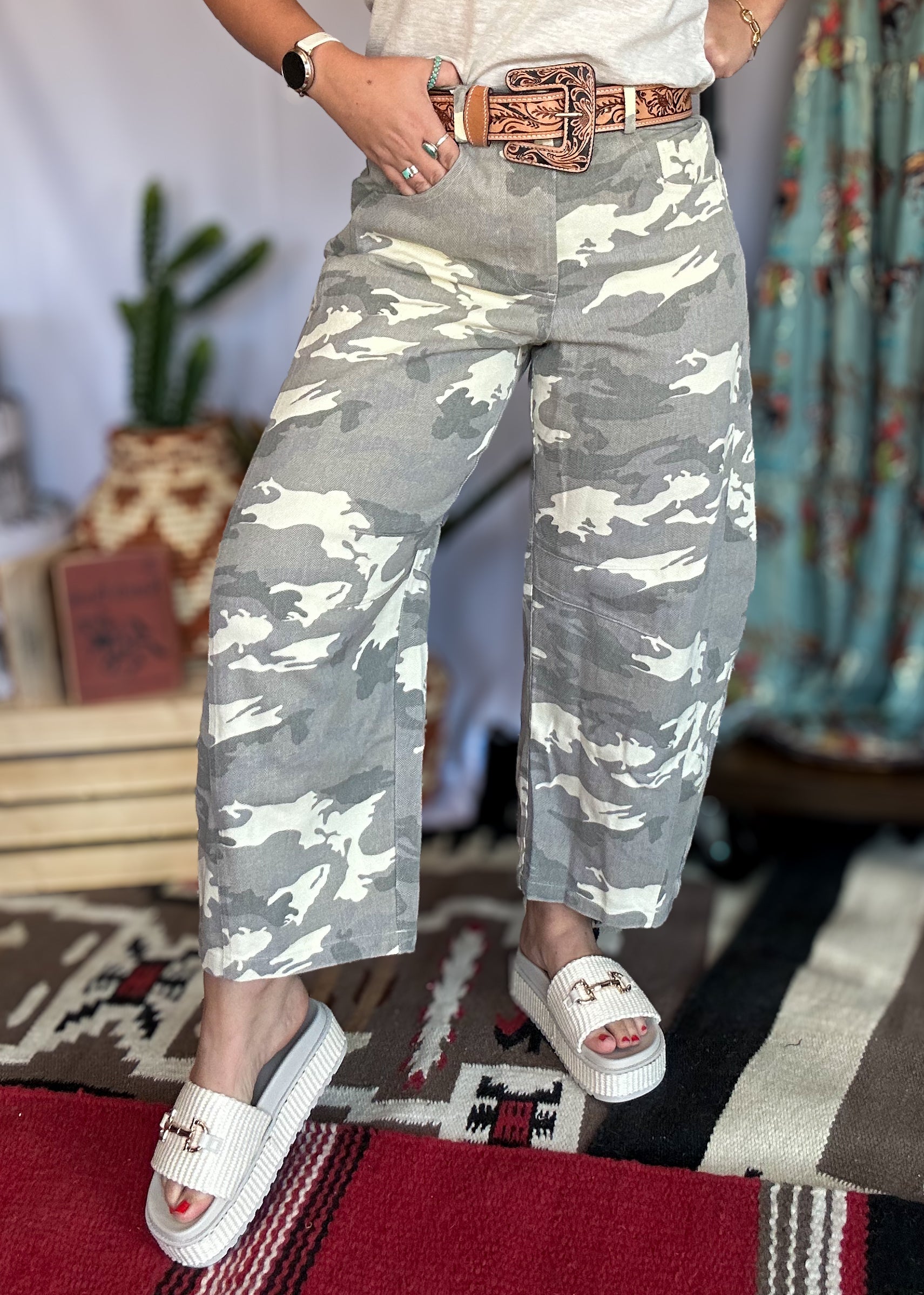 Take on the day in the laid-back confidence of the Frontier Fade Barrel Pants. With a soft grey-and-cream camo that feels broken-in from the first wear, these pants blend rugged charm with an easy barrel-leg fit. Perfect for hitting the market, kicking back on the porch, or pairing with boots for a night out.