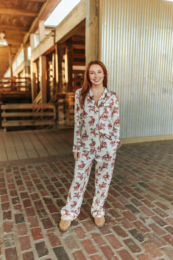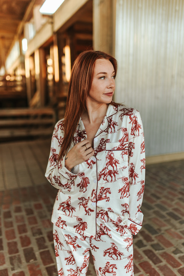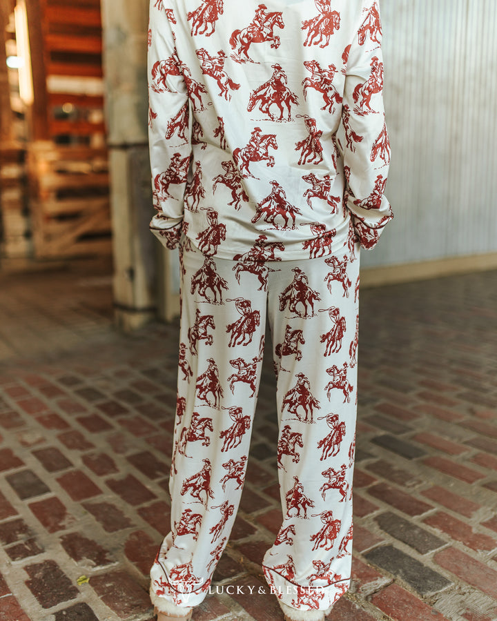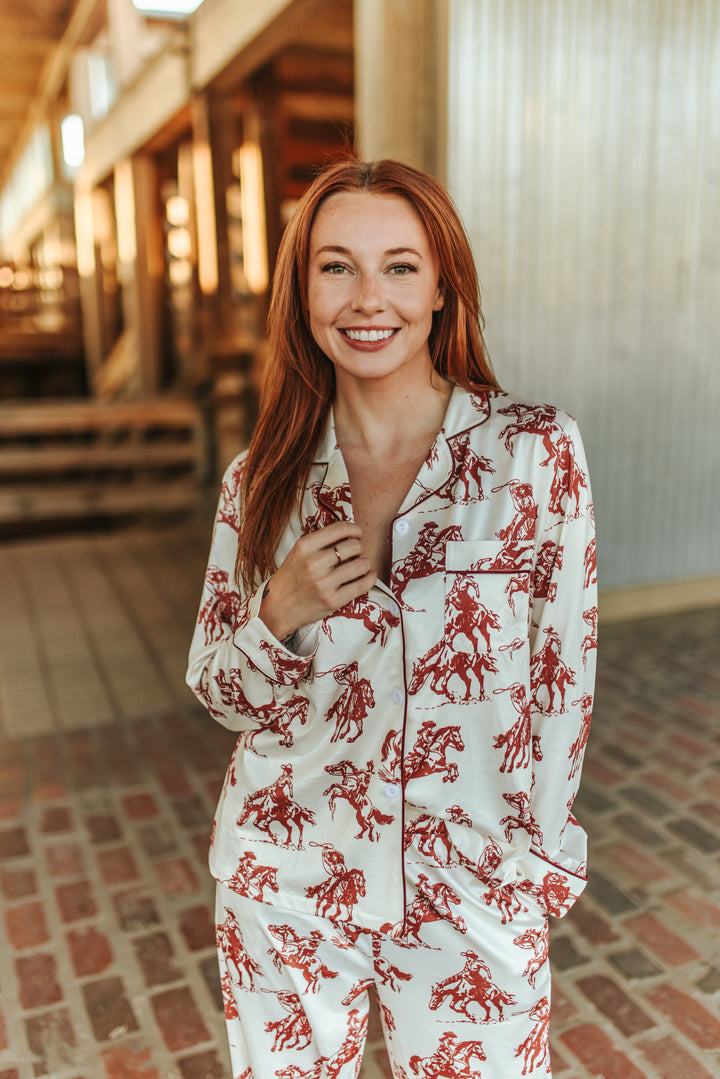 Sweet dreams, cowgirl. This one’s for the girls who fall asleep thinking about wide-open pastures and wake up ready to ride. The Heritage Rider Pajama Set brings classic Western artwork and vintage ranch vibes straight to your wind-down routine. With its ivory base and rich heritage rider print, this set feels timeless, nostalgic, and just bold enough to make lounging look good.