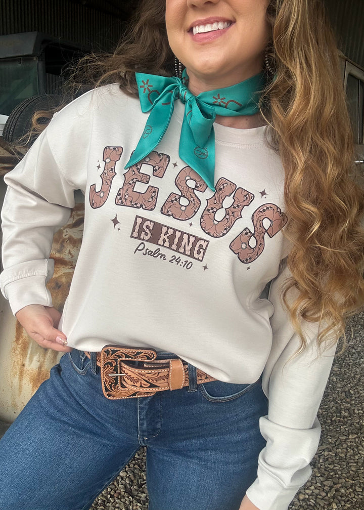 A sweatshirt with a message that stands firm — The Jesus Is King Sweatshirt is for the cowgirl who wears her faith as boldly as she wears her Western style. Featuring a tooled-leather–inspired “JESUS” graphic and Psalm 24:10, this piece blends heartfelt devotion with that signature Western edge. Soft, cozy, and made to uplift, it’s the kind of sweatshirt that speaks before you ever say a word.