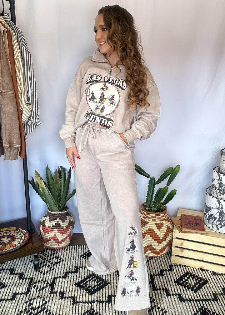 The rodeo isn’t just a weekend—it’s a lifestyle. The Las Vegas Legends Lounge Set brings that bold arena spirit into your everyday wardrobe. Designed with vintage rodeo graphics and a relaxed fit, this set is made for cowgirls who live and breathe Western grit, whether they’re in the stands or at home on the ranch.