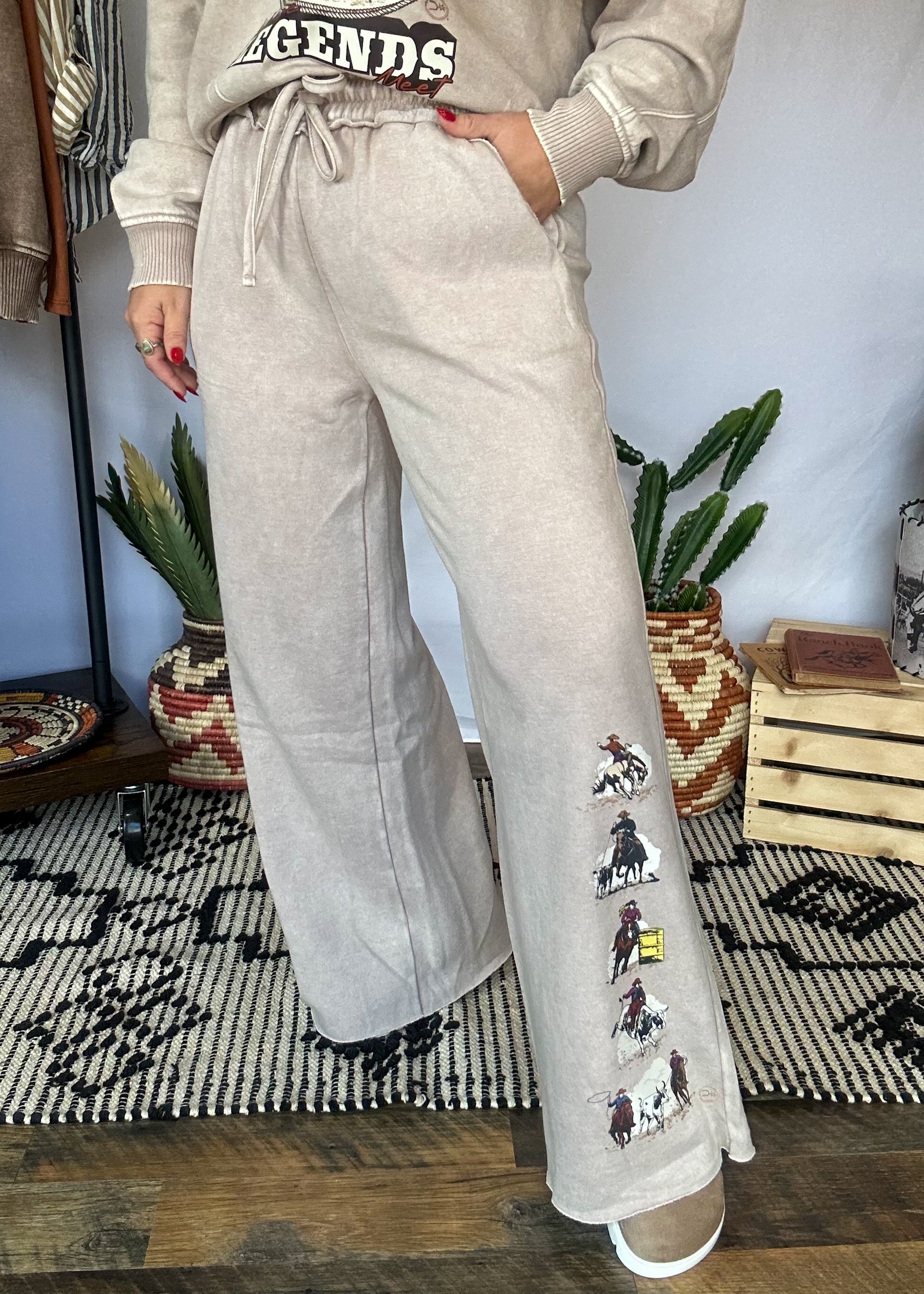 ✔️ Wide-leg pants with matching bronc rider graphics down the leg