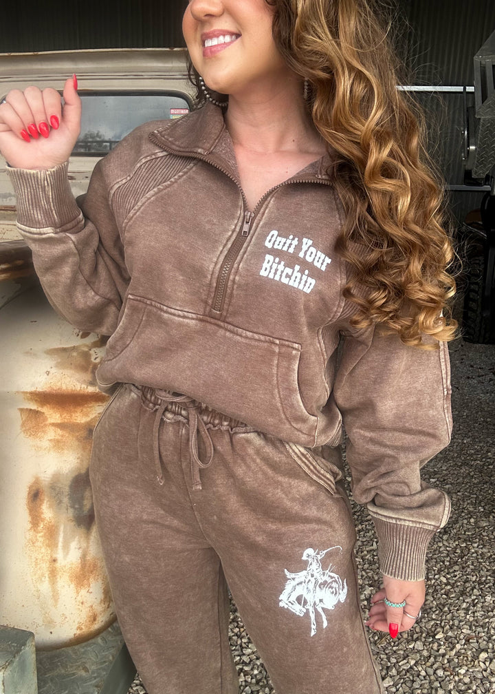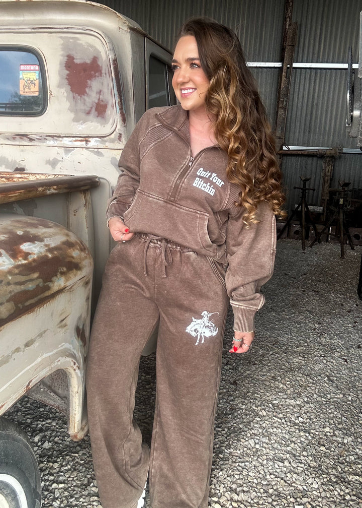 For the gals who keep it real and run on grit (and caffeine). Our Quit Your Bitchin’ Quarter Zip Set is made for tough days, big laughs, and unapologetic attitude. The quarter zip features a bold front print that says what we’re all thinking — paired with wide-leg sweatpants featuring a fierce cowgirl graphic that seals the deal.