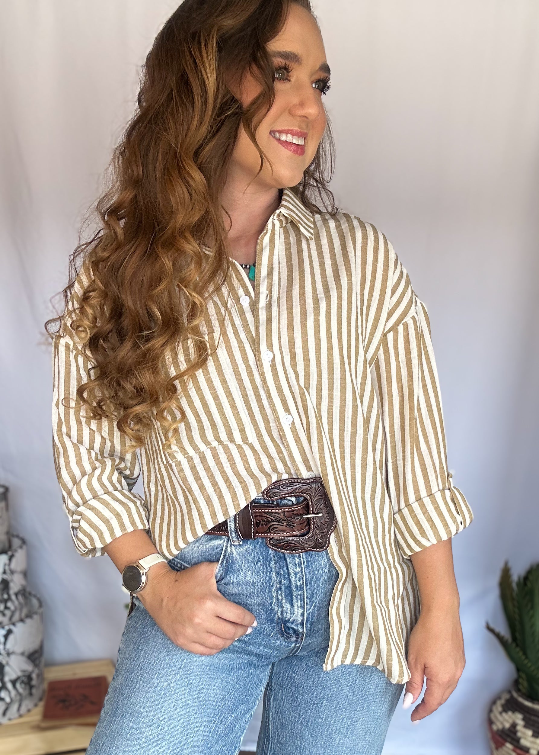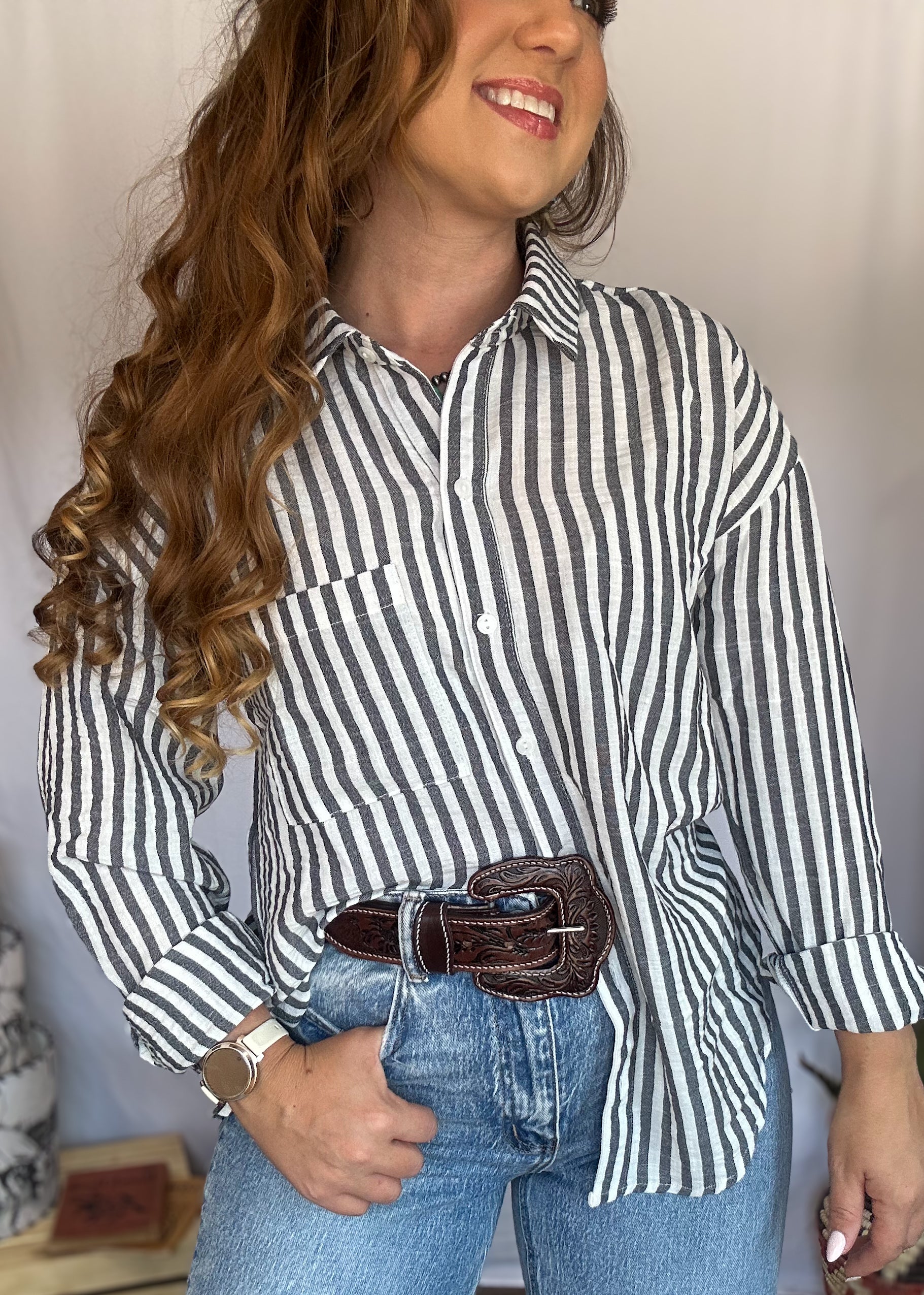 For the cowgirl who does it all, meet the Ranch Hand Stripe Shirt — bold stripes with a laid-back Western edge. Whether you’re ropin’, ridin’, or just running errands, this one’s made to keep you looking sharp without trying too hard.