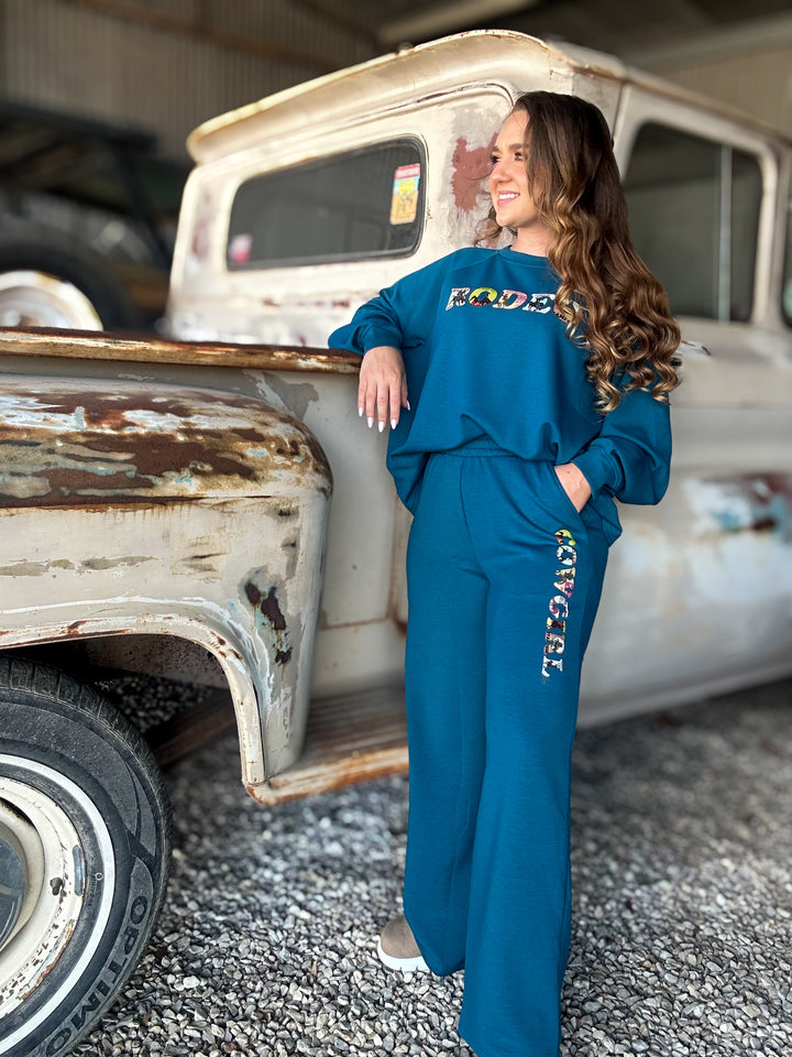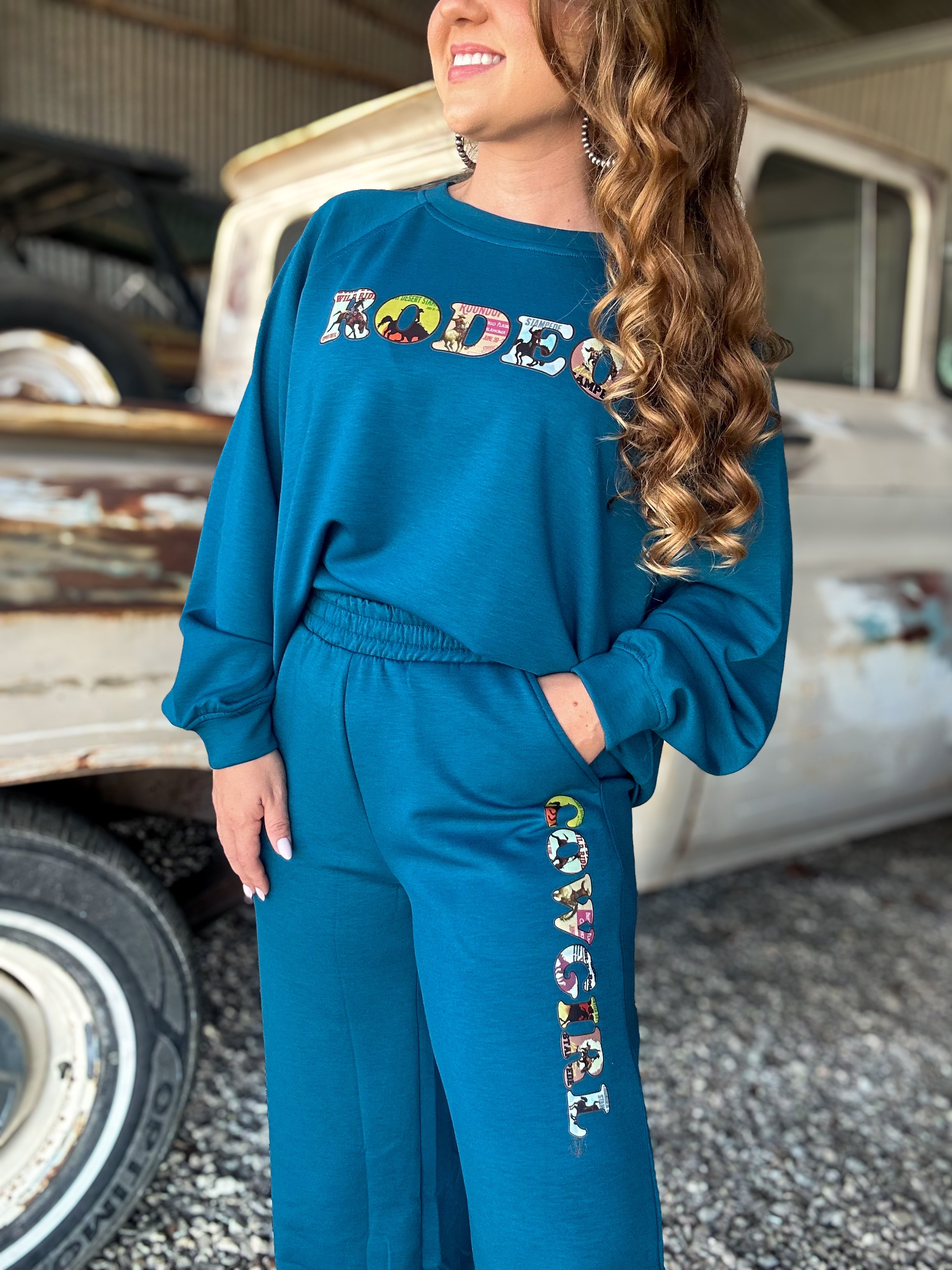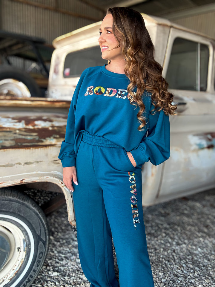 Kick it old school with the Retro Rodeo Lounge Set—a bold blend of Western grit and vintage flair. With rodeo poster-style lettering splashed across the front, this set feels like it was pulled straight from the golden days of the arena.