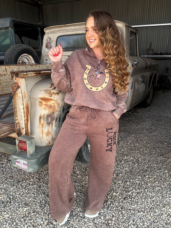 When your Western spirit meets cozy comfort — this set’s what you’ll be reachin’ for every weekend. Our Ridin’ Lucky Quarter Zip Set brings rodeo flair to laid-back days, with a bold embroidered horseshoe and bronc rider that say “cowgirl at heart.” The washed, lived-in look gives it that worn favorite feel right outta the gate — soft, easy, and ready to ride.