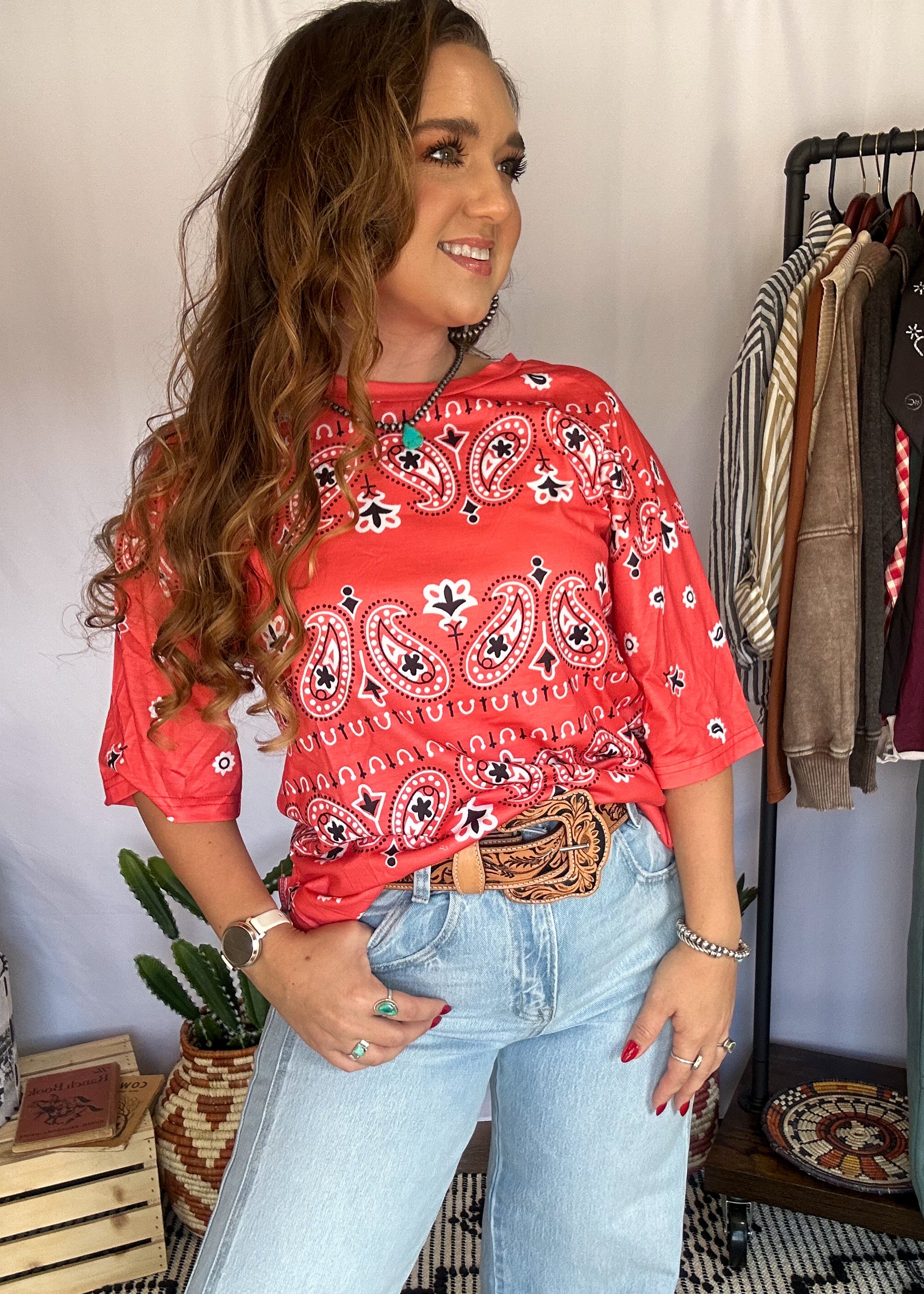 Turn heads in this bold and carefree Rust Paisley Bandana Tee — a Western classic with a punchy twist. With its all-over paisley bandana print and easy, relaxed fit, this tee is made for rodeo nights, county fairs, and every small-town adventure in between.