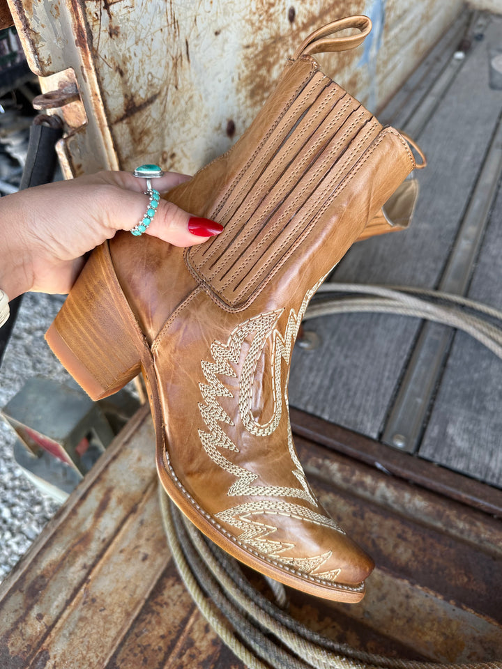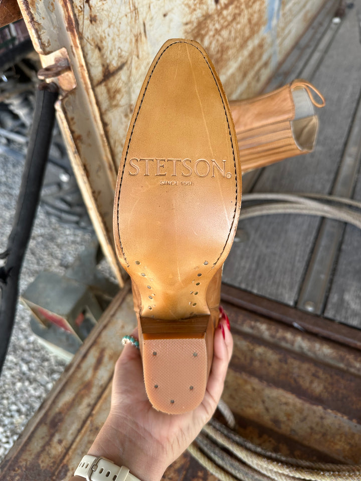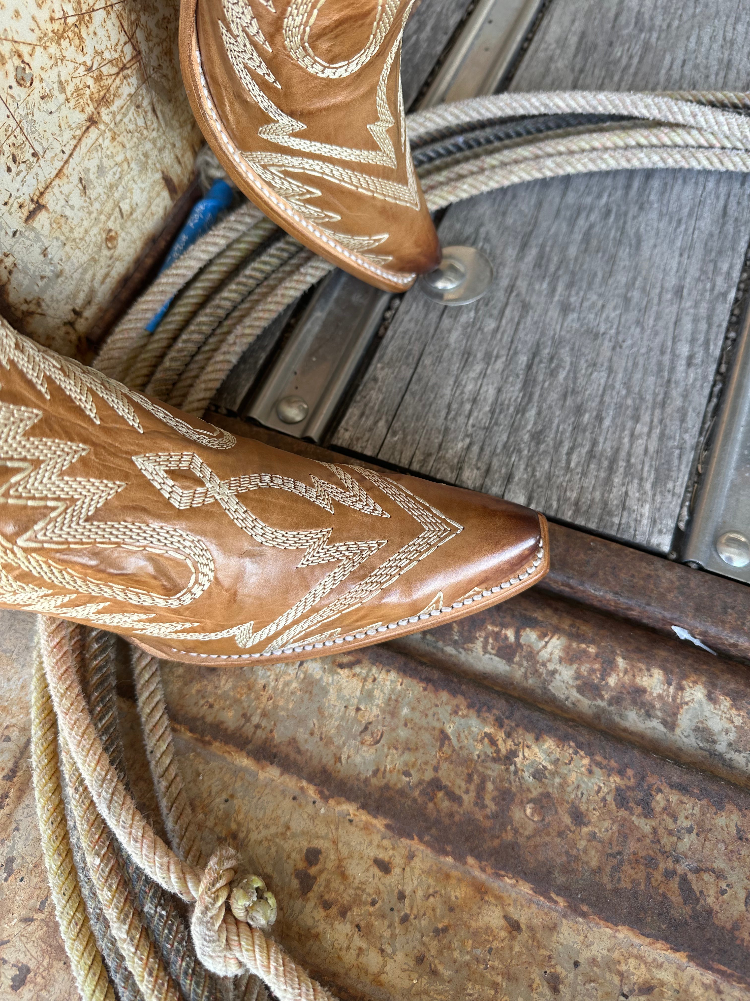 A boot that’s as bold as the Western sky—crafted for the cowgirl who never blends into the crowd. The Stetson Desert Bloom Ankle Boots bring together timeless craftsmanship with a fresh, fashion-forward silhouette. Featuring rich tan leather with intricate cream stitching, these boots are made to stand out at the rodeo, on the dance floor, or anywhere you’re raising dust.