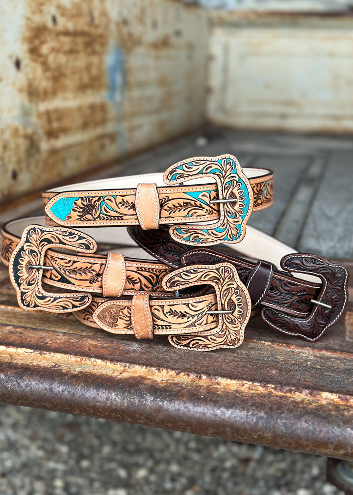 Classic Western craftsmanship with a fresh twist. The Rodeo Drive Scalloped Belt is built for cowgirls who know tradition but love a little edge. Hand-tooled leather meets a brand-new scalloped tooled buckle—a statement design that sets this belt apart from the rest. Whether you’re cinching your rodeo jeans or dressing up your favorite denim skirt, this piece brings rugged charm and timeless Western flair.