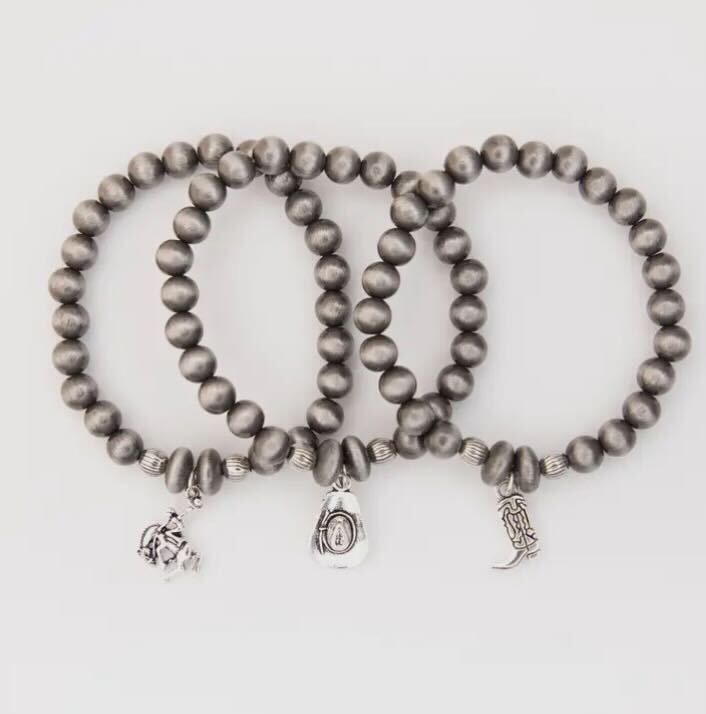 The Westbound Stack is a 3-piece western beaded bracelet set made for the girl who carries a little rodeo spirit everywhere she goes. Each strand features classic ranch-style beads finished with detailed charms — a bronc rider, cowboy hat, and boot — bringing subtle movement and bold personality to your wrist.