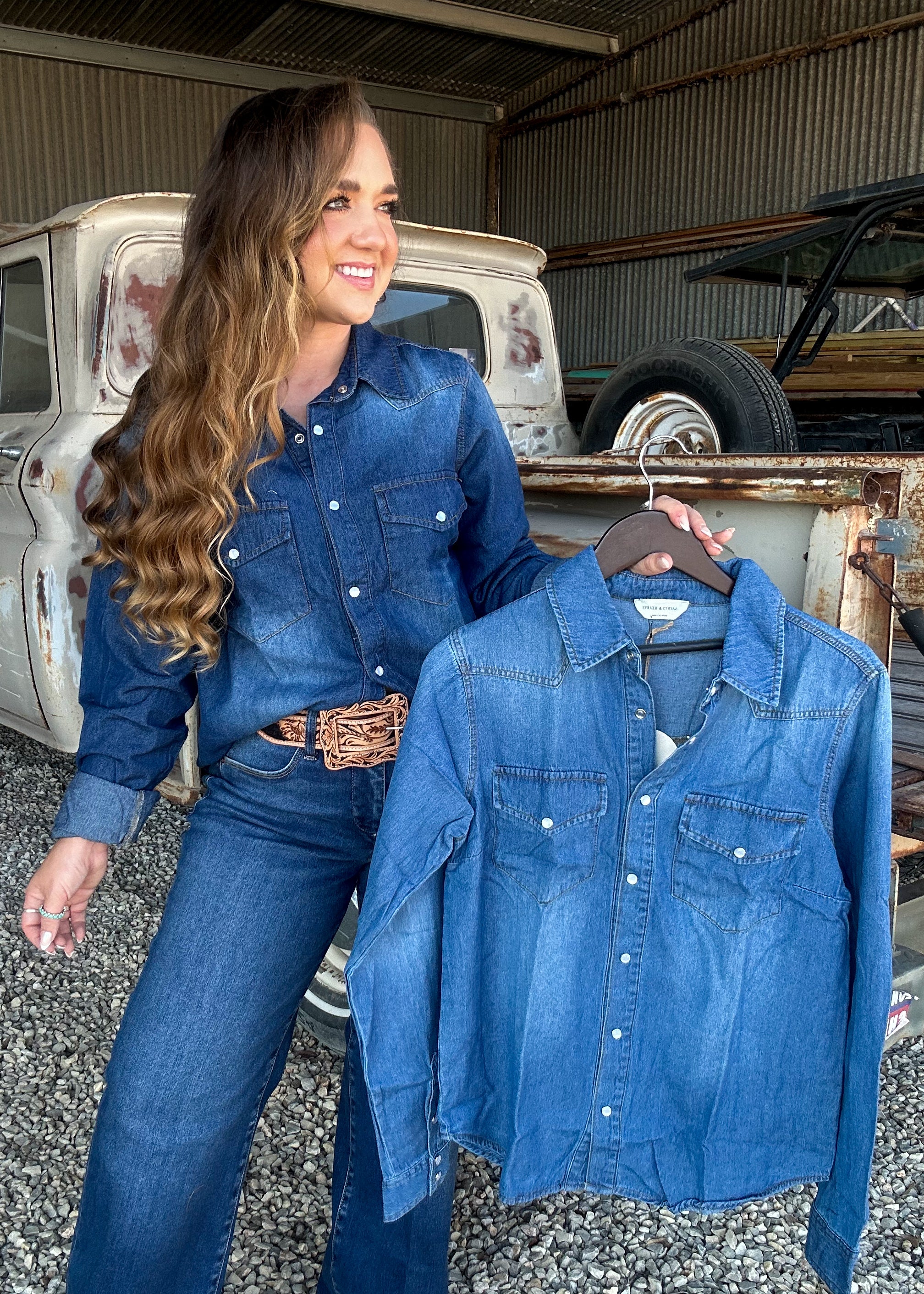 Every cowgirl needs a trusty denim button-down, and this one is a classic. Lightweight yet durable, it’s perfect for layering under vests, tucking into your favorite jeans, or wearing loose for that effortless Western vibe. The pearl snap buttons and chest pockets give it an authentic rodeo-ready edge.
