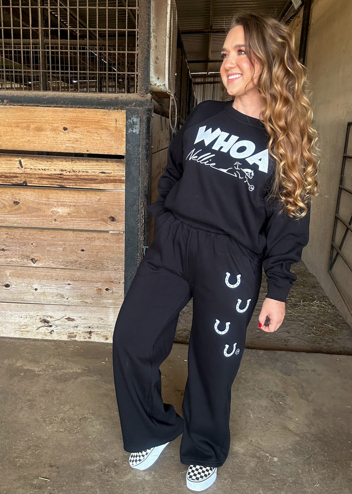 ✔️ “Whoa Nelly” graphic top with matching horseshoe-print wide-leg bottoms