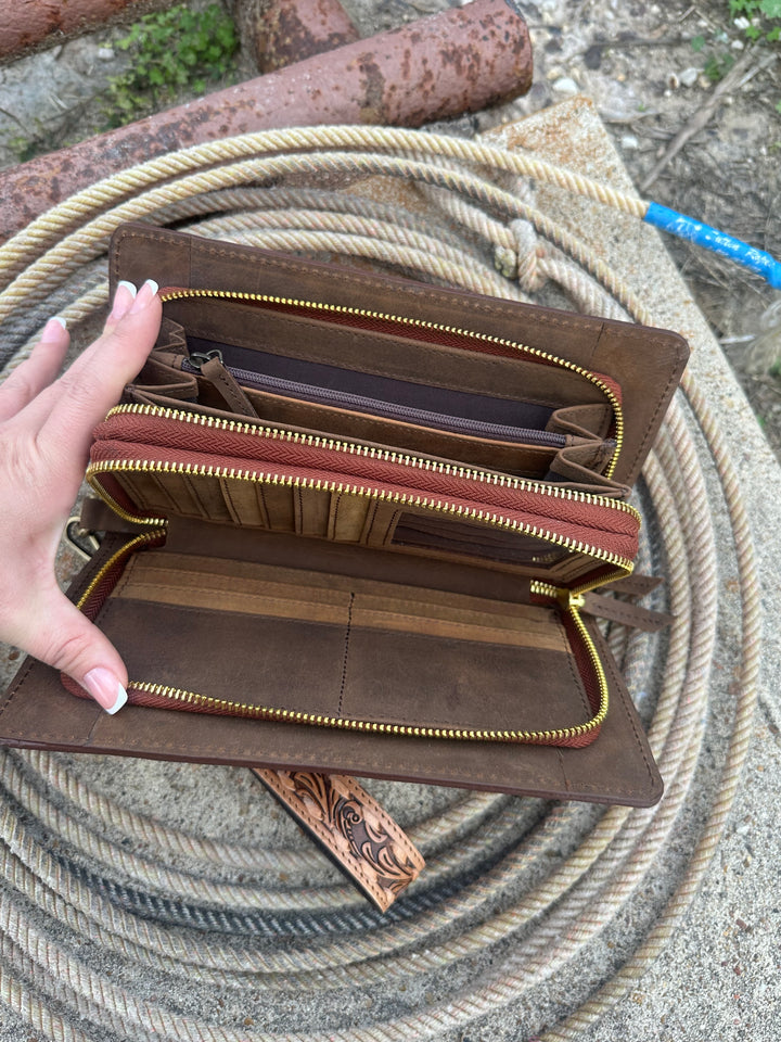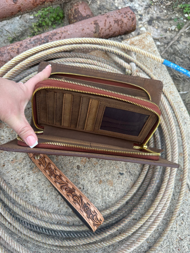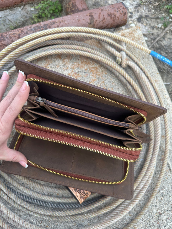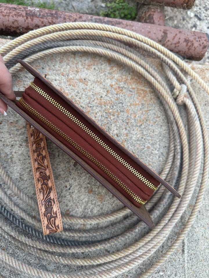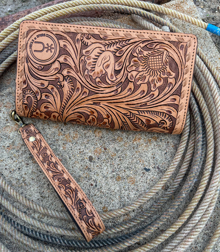 Keep your cash, cards, and cowgirl charm all in one place with the Tooled Organizer Wallet. Handcrafted from genuine tooled leather, this wallet features intricate floral stamping that matches our Cowgirl Speedy Purse. Use it solo with the wristlet strap or tuck it in your favorite bag—either way, it’s western perfection in your palm.