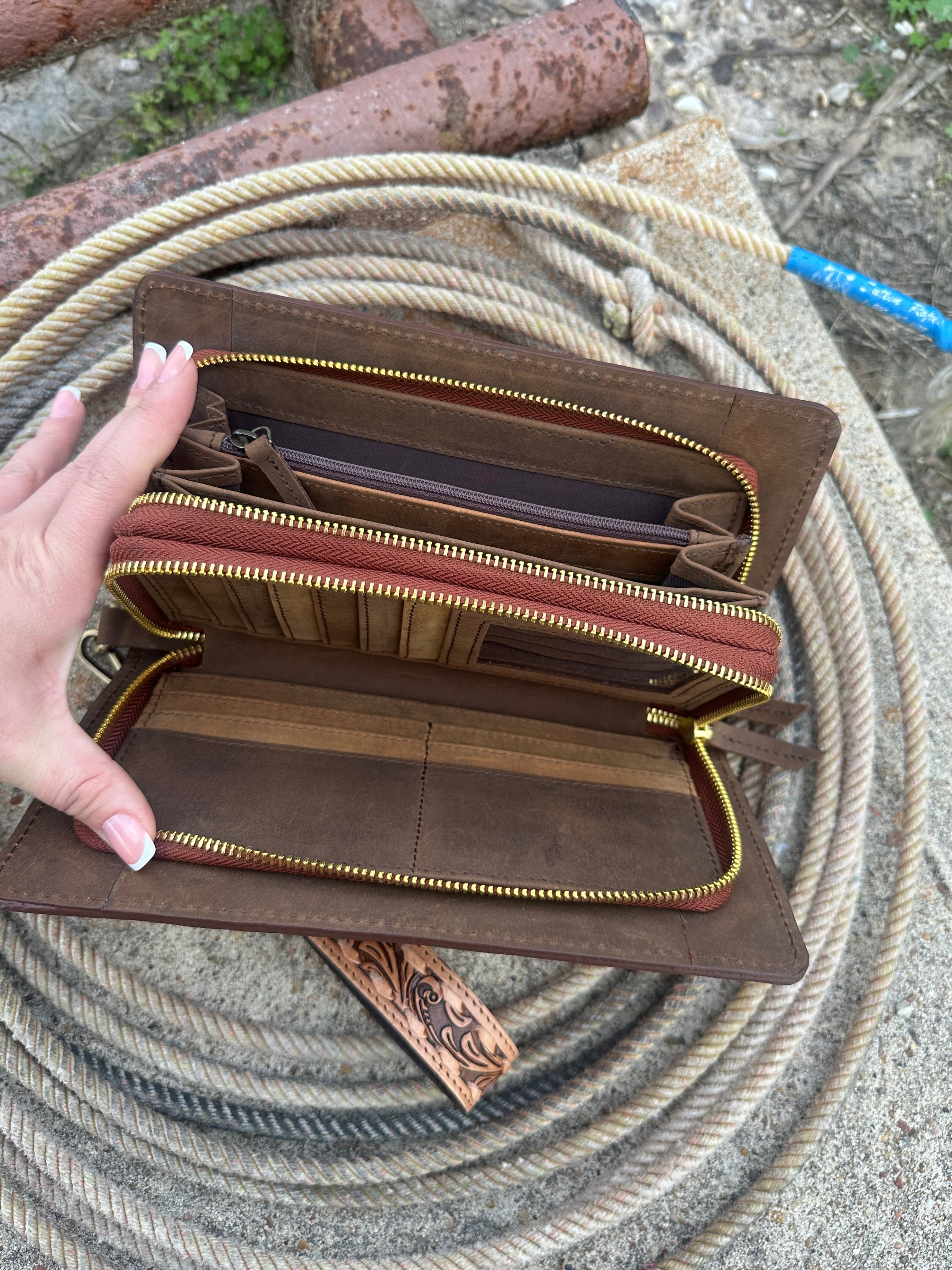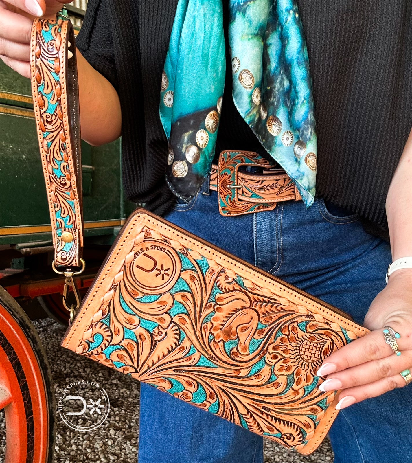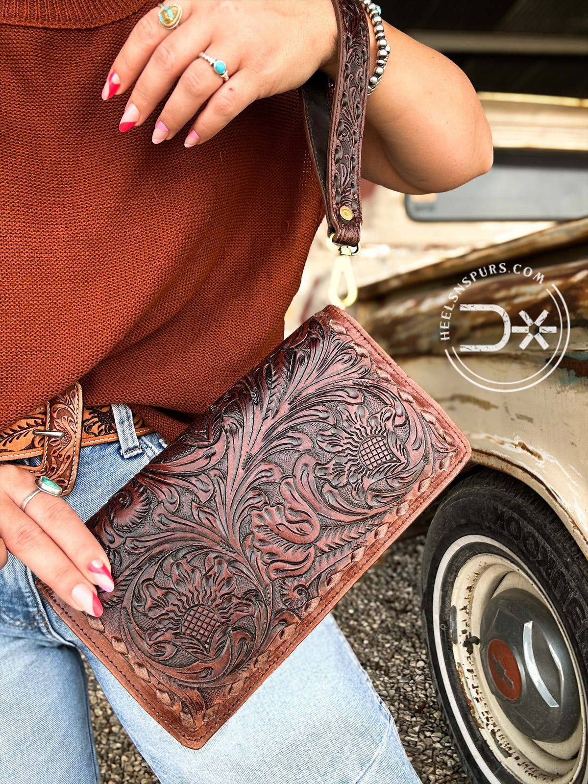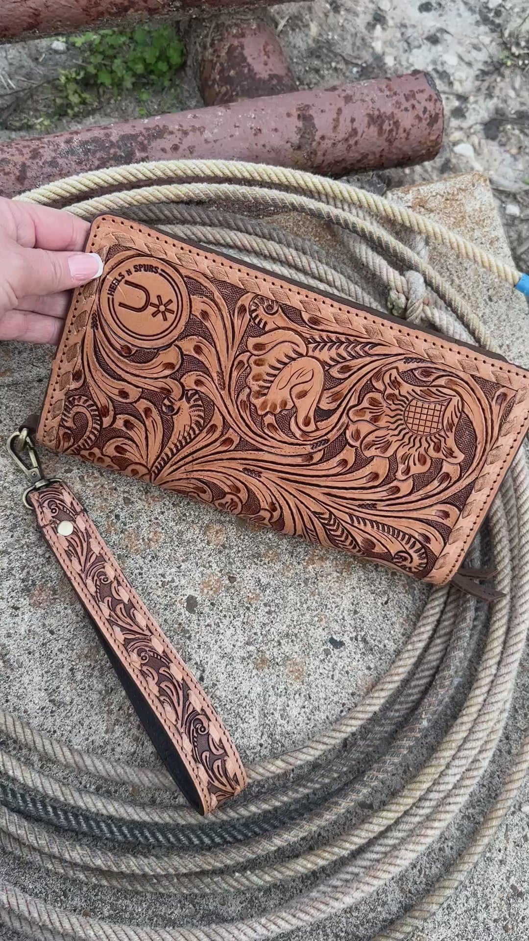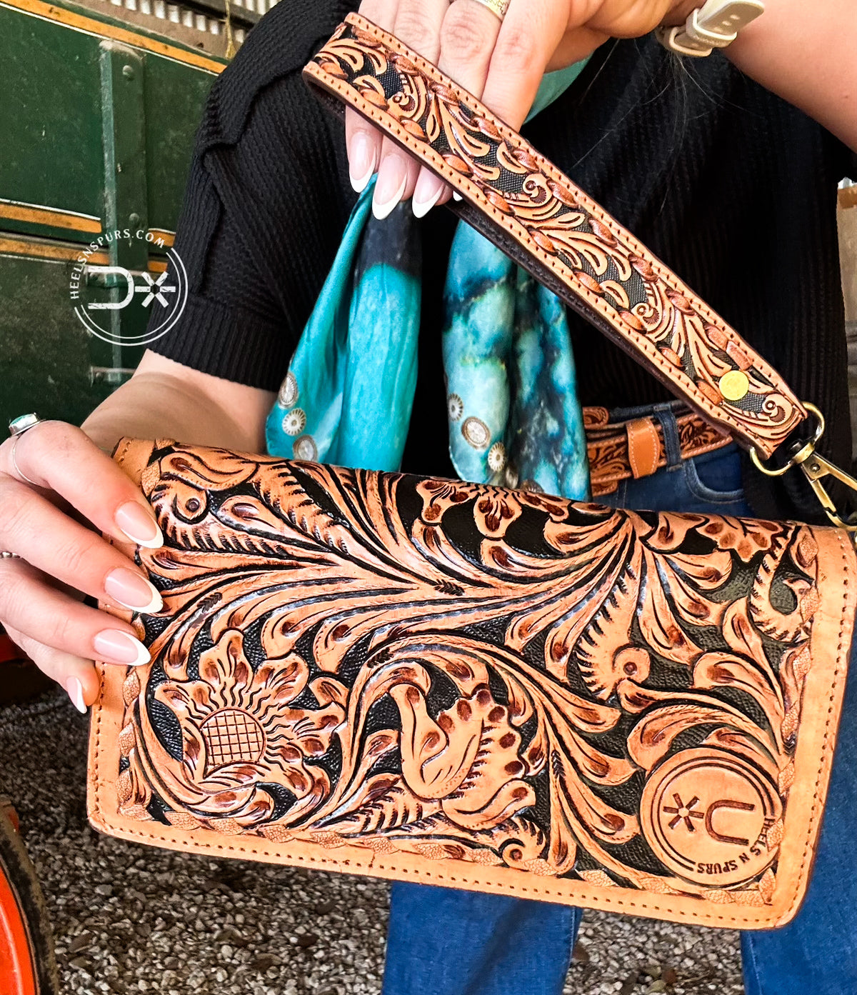 Keep your cash, cards, and cowgirl charm all in one place with the Tooled Organizer Wallet. Handcrafted from genuine tooled leather, this wallet features intricate floral stamping that matches our Cowgirl Speedy Purse. Use it solo with the wristlet strap or tuck it in your favorite bag—either way, it’s western perfection in your palm.